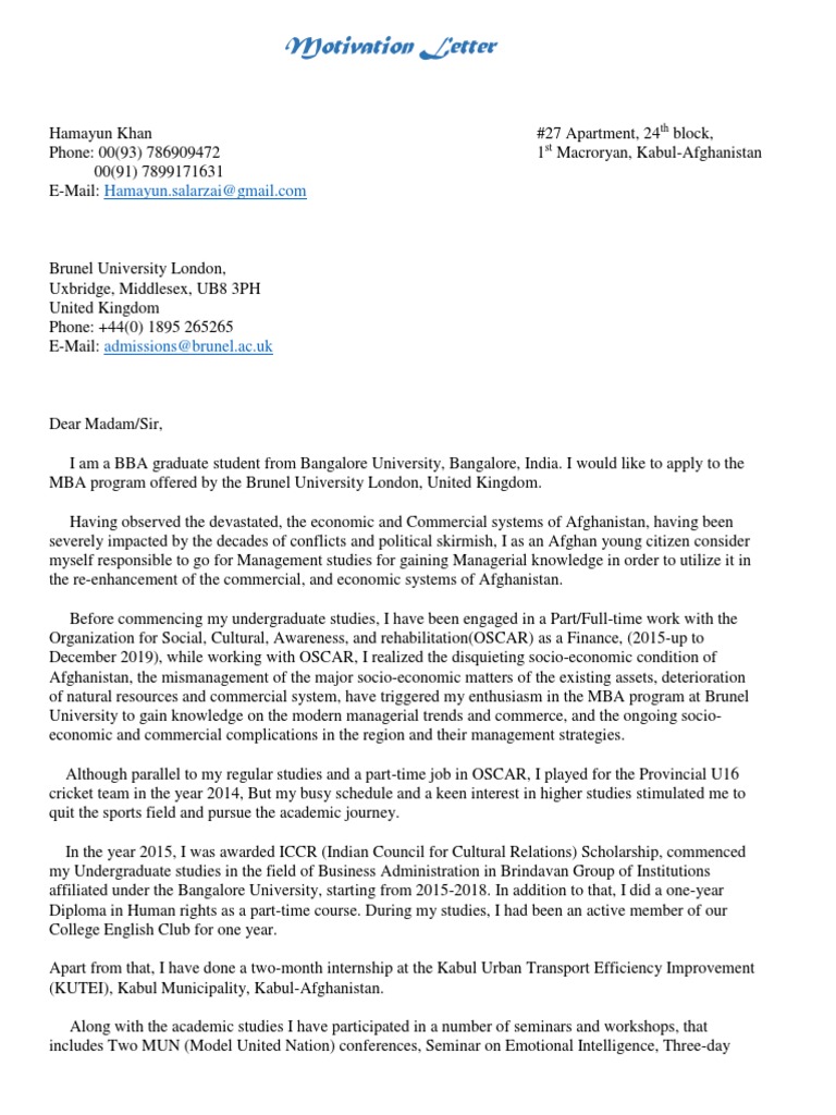 Today we bring you a genuine sample motivation letter for mba sent this year for master degree application.