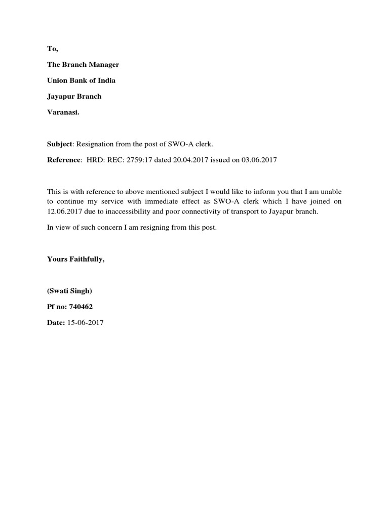 Resignation letter format 1 your name your residential address city, state, postal code telephone number to: Name of immediate supervisor designation company name company. [name] [job title] [bank name] dear [manager's name], i am writing this letter to inform you i am resigning from my post of [job title] at [bank.